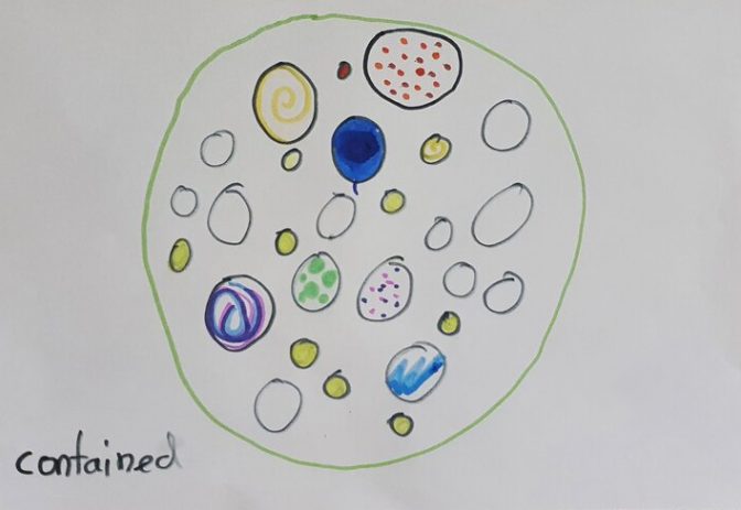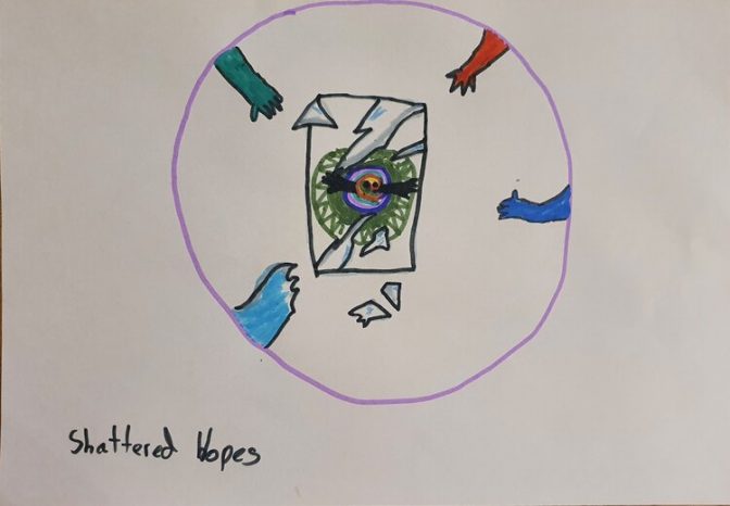 This is an example of picture tapping technique. The first drawing is titled ‘Shattered Hopes’ and the second is titled ‘Contained’.