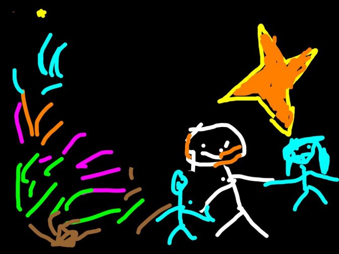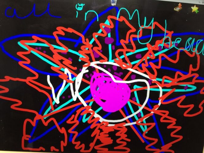 This is an example of serial drawing technique. The first drawing is titled ‘Mum in hospital’ and the second is titled ‘Together again’.