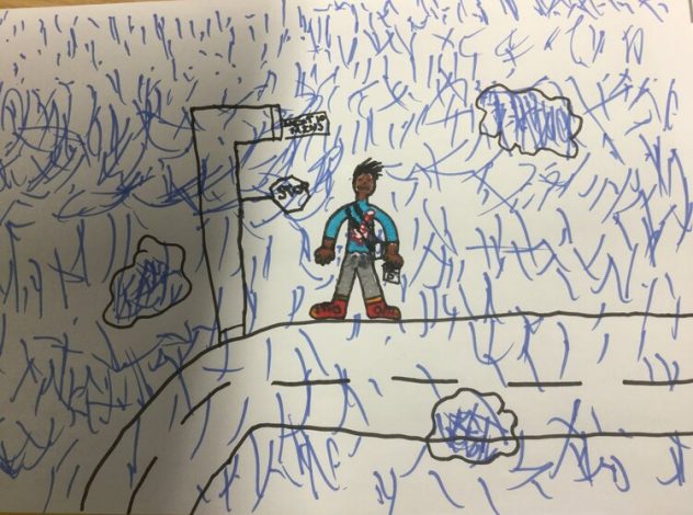 The first drawing is an expressive/projective drawing, where the young person draws a person in the rain. The amount of rain, and the amount of protection e.g. umbrella, waterproof coat etc give an indication of how the young person is feeling.